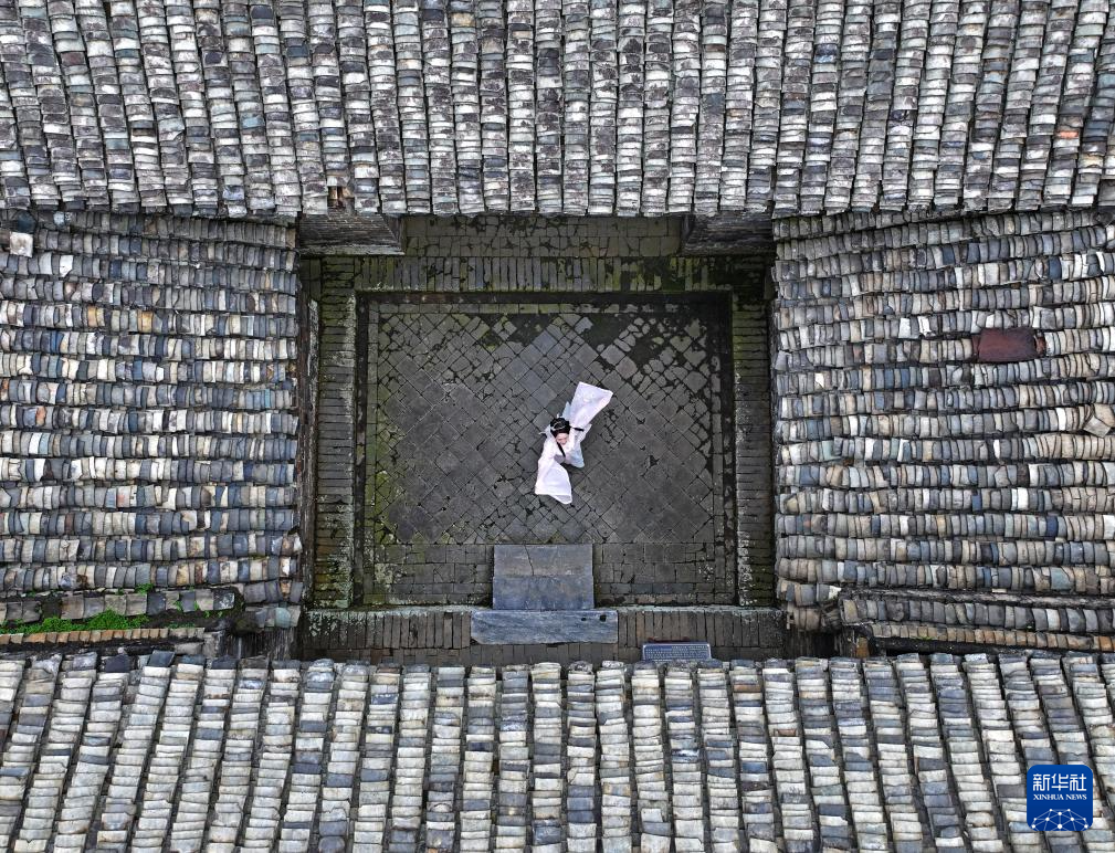 8月16日,一名身着汉服的游客在大芦村古建筑群里跳舞(无人机照片)。