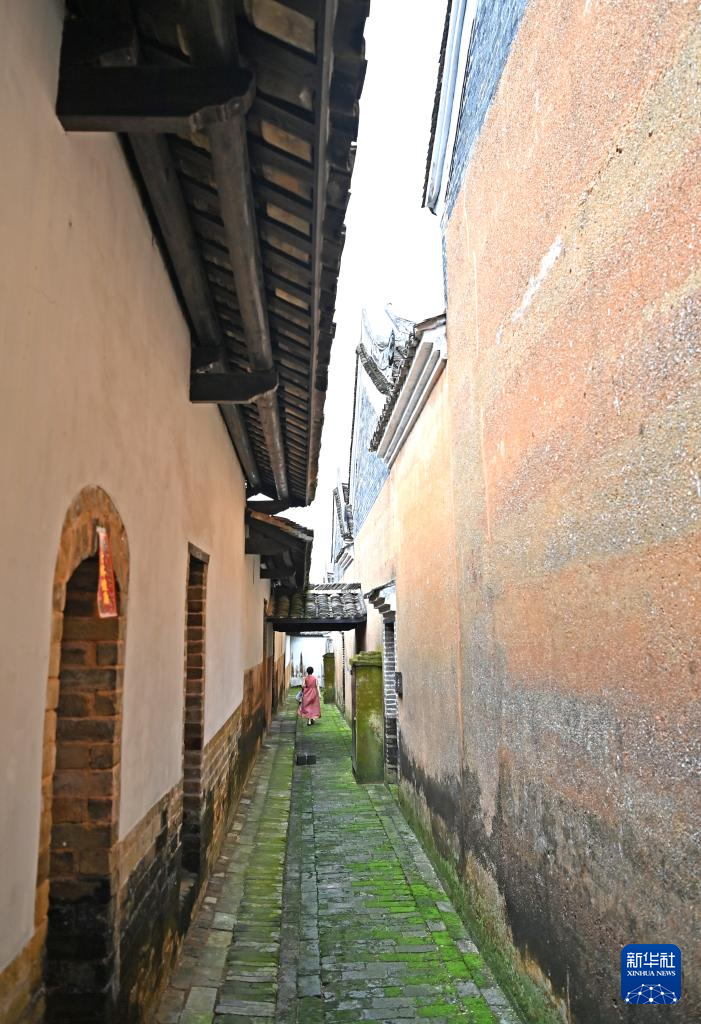 8月16日,一名村民在大芦村一条小巷里穿行。