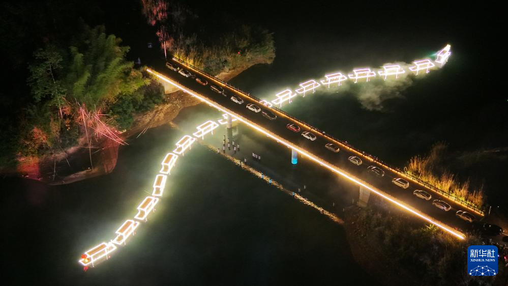 5月1日晚,百米龙排遨游在广西东兰县坡豪湖国家湿地公园。