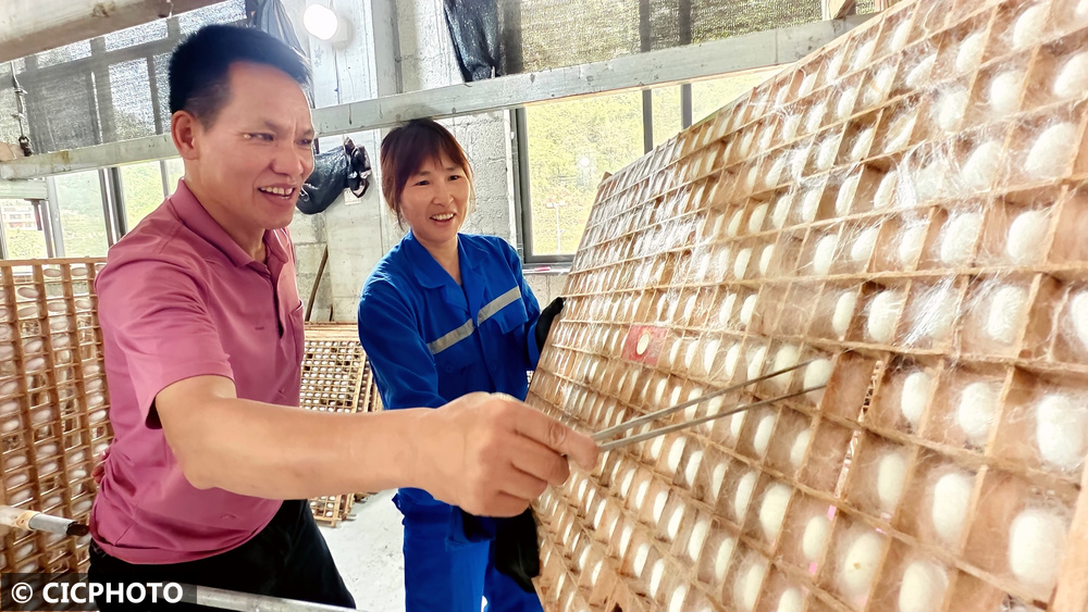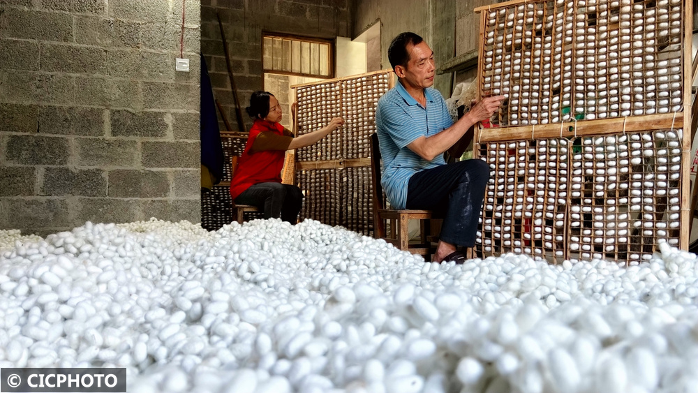 近年来,广西都安瑶族自治县大兴镇大力发展桑蚕产业,在大兴镇林堂村刁歪屯建成1000平方米的示范基地,推广轨道喂叶、自动上蔟、机械摘蚕茧等高效省力的养殖技术,助力村民增收。