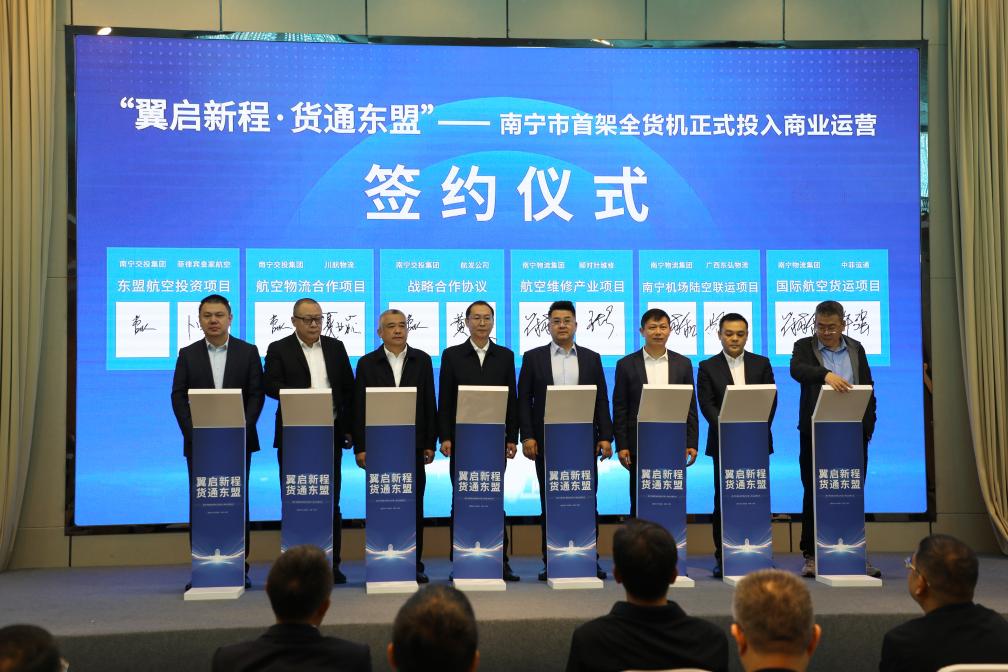 运营仪式现场,8家航空物流企业还共同签署了战略合作协议。各方计划整合资源,“链”接各方在航线运营、商贸运输、产业配套等方面的优势,积极推进物流与贸易、加工、维修等航空产业融合发展,形成南宁市“运贸结合、以贸促工”的新格局。