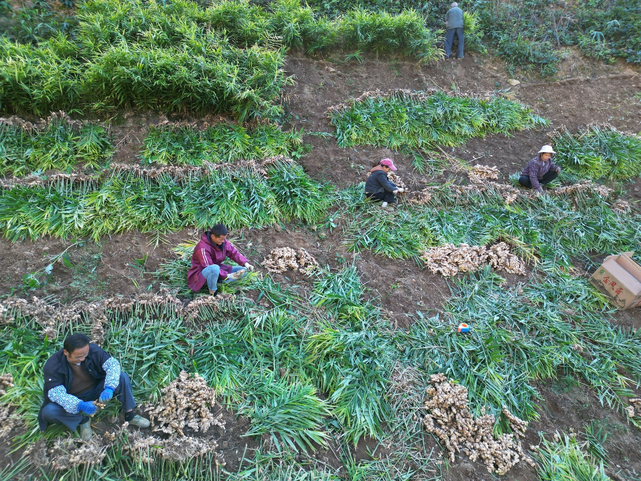 走进大发瑶族乡广运村的生姜种植基地,映入眼帘的是一派繁忙景象。姜农们三五成群,分工协作,动作娴熟。只见他们轻轻撬开松软的泥土,小心翼翼地将一株株形态饱满、颜色鲜亮的生姜从地里拔出。刚刚出土的生姜,块大饱满,色泽金黄,形如手掌,带着泥土的芬芳。