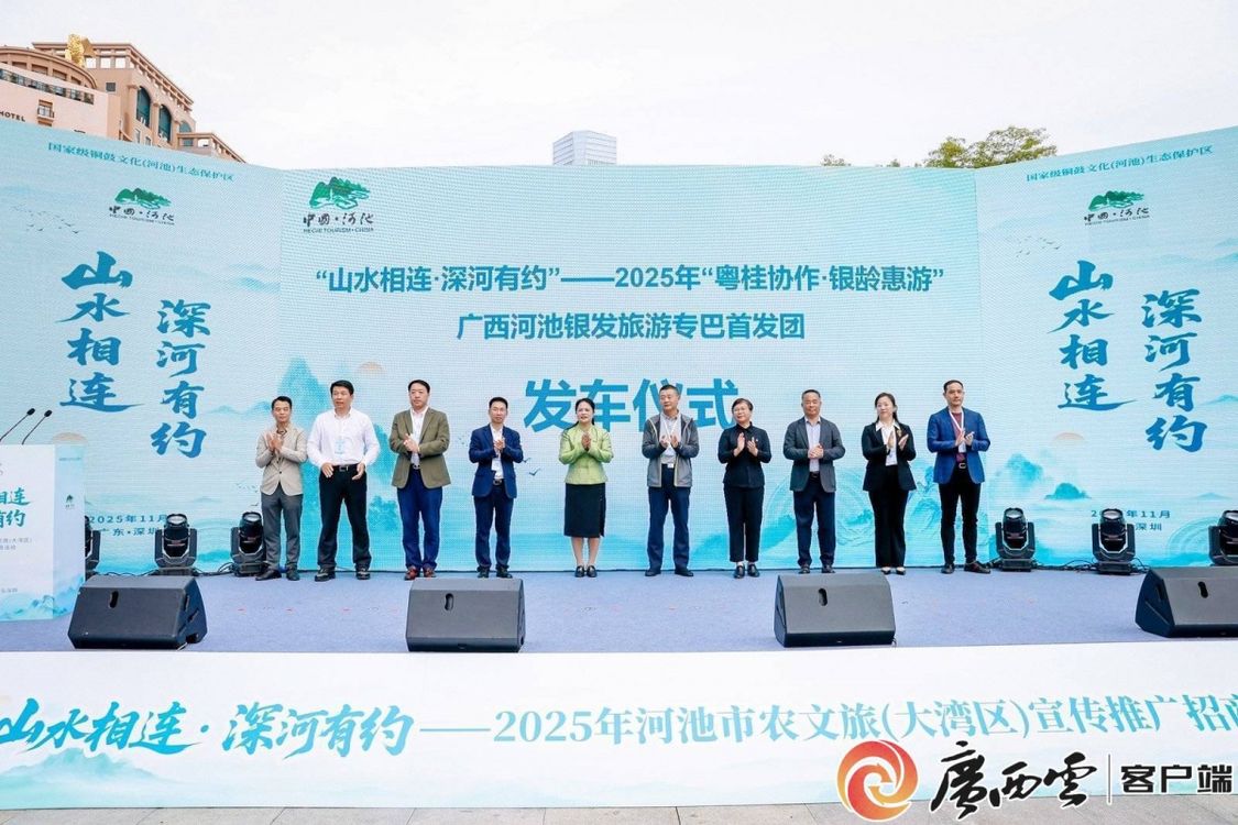 活动期间,还隆重举行了“山水相连·深河有约”——2025年“粤桂协作·银龄惠游”广西河池银发旅游专巴首发团发车仪式,首批大湾区游客将前往河池,体验“冬游广西·康养河池”的独特魅力,进一步深化深河农文旅协作,将河池打造成为粤港澳大湾区的重要旅游目的地和康养胜地。