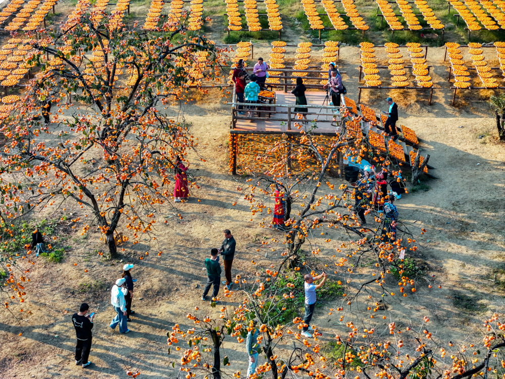 冬日时节,广西桂林市恭城瑶族自治县莲花镇红岩村万亩柿林进入最佳观赏期,游客纷至沓来,感受丰收的喜悦。