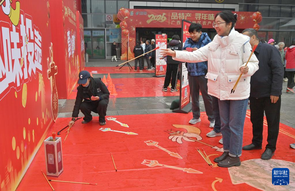1月24日,在广西南宁国际会展中心,市民在年货大集现场体验投壶。