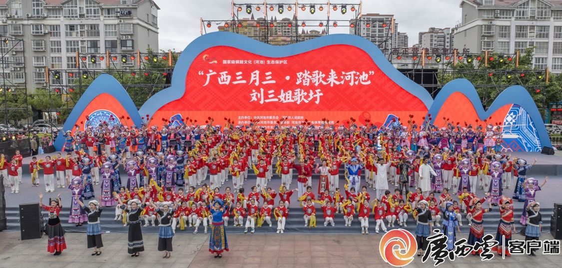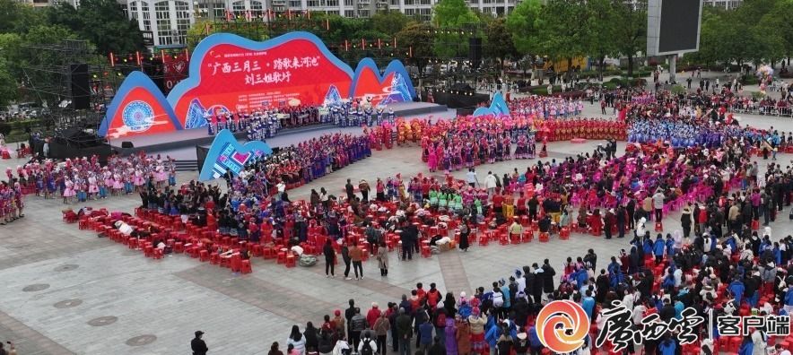 原标题:千人拉歌 万人合唱 “广西三月三·踏歌来河池”刘三姐歌圩盛况空前