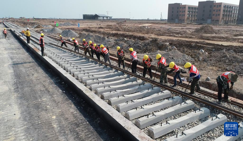 这是钦州港东站扩建工程钢轨铺设现场(2019年6月27日摄)。