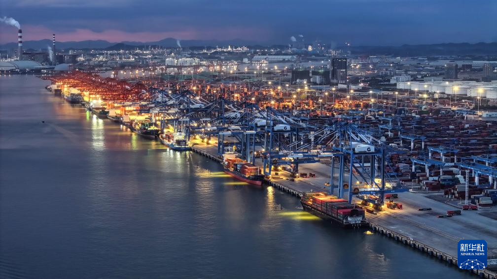 这是黄昏时分的钦州港,龙门吊在作业(9月16日摄,无人机照片)。