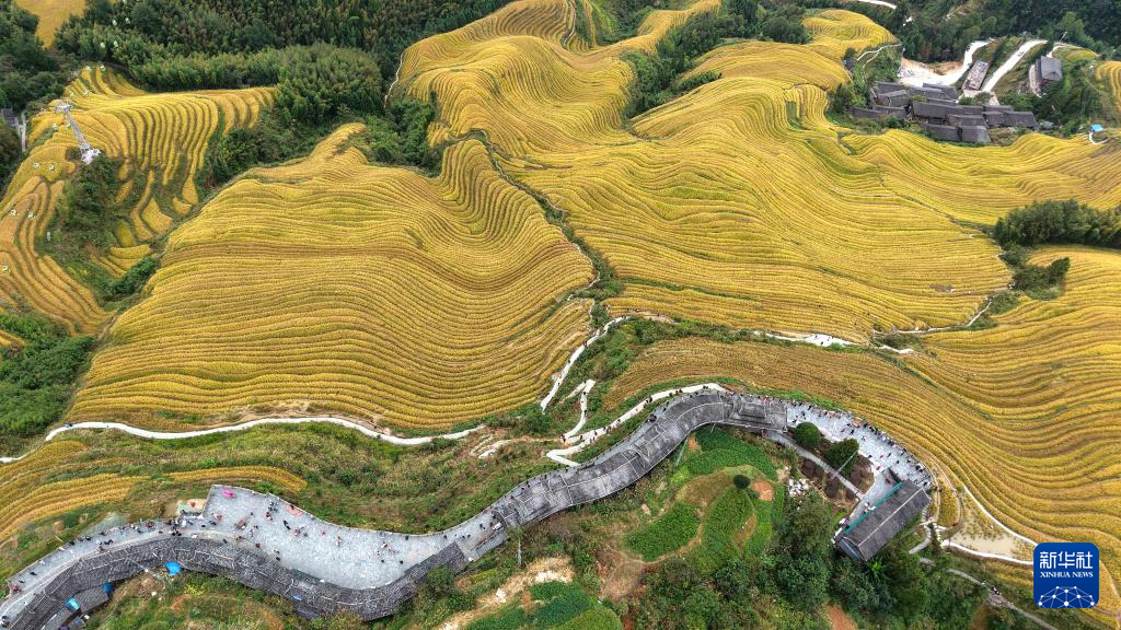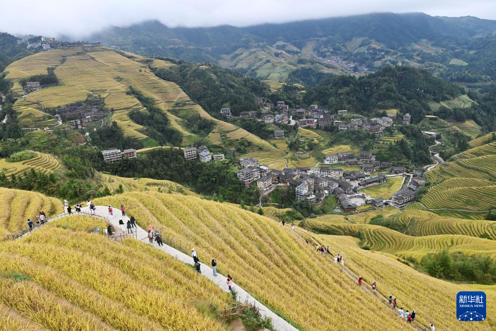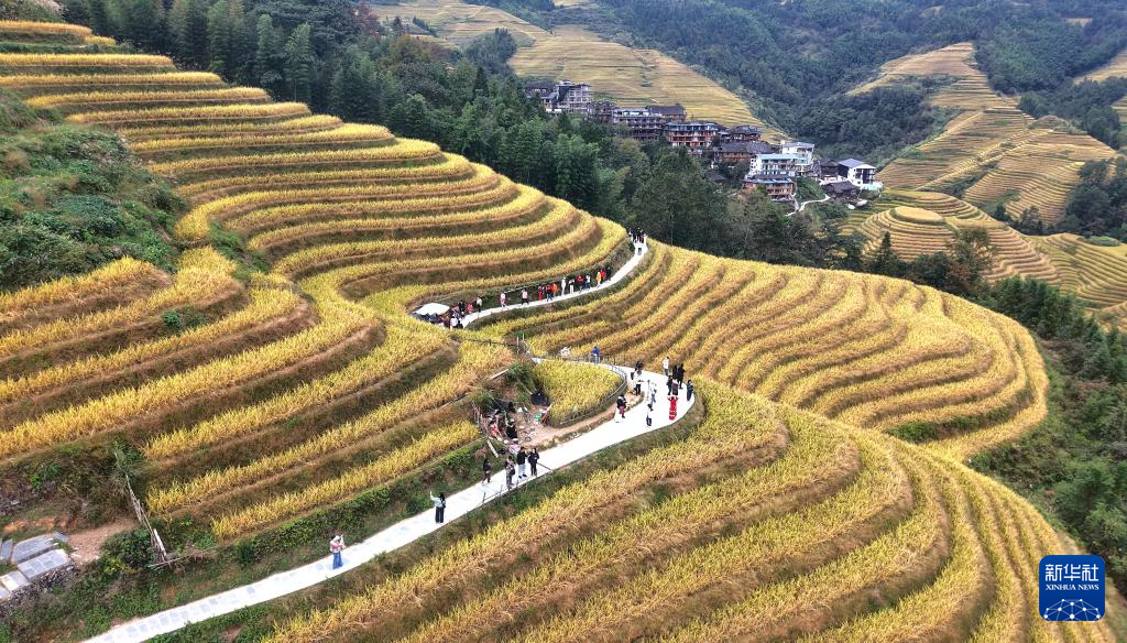 眼下,广西龙胜各族自治县龙脊梯田一片金黄,成为众多游客观光“打卡”的热门景点。龙脊梯田已有2300多年历史,是联合国粮农组织认证的全球重要农业文化遗产。