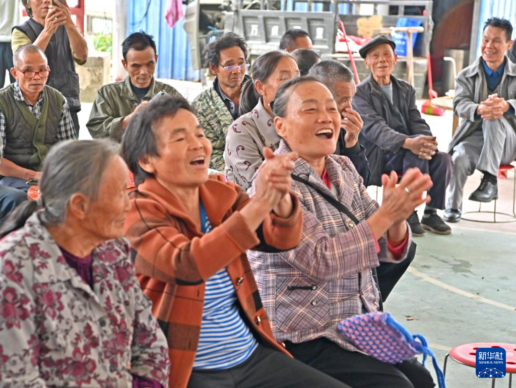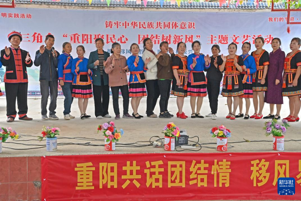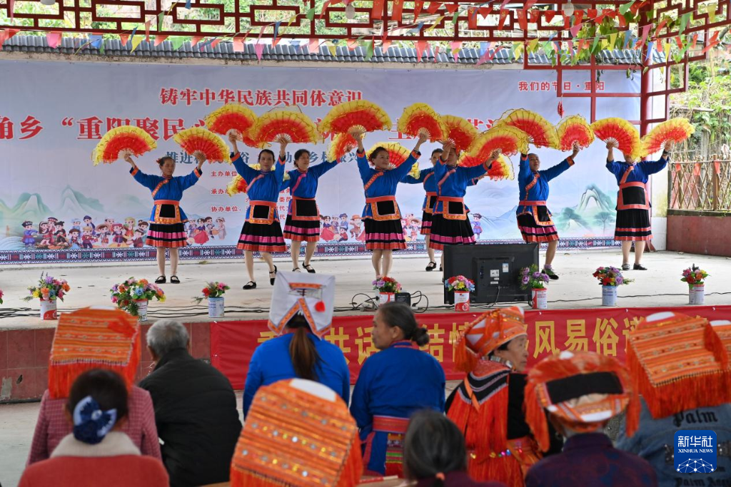 10月29日,两地群众在广西金秀瑶族自治县三角乡六定村进行重阳节文艺活动。新华社记者 周华 摄