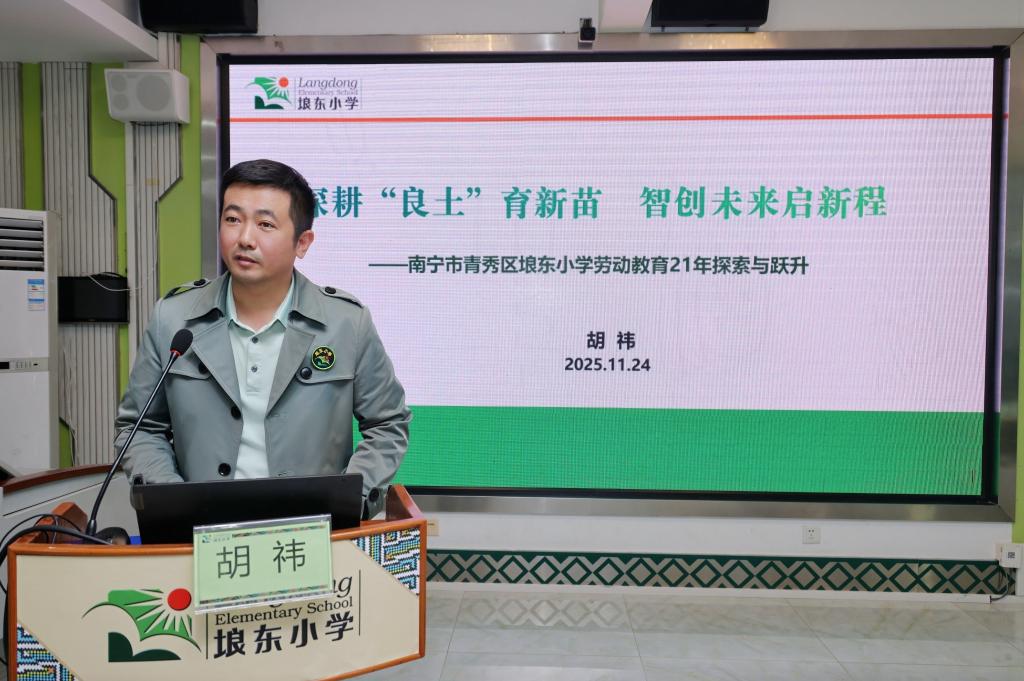 交流互动环节中,南宁市青秀区埌东小学校长胡祎以《深耕“良土”育新苗 智创未来启新程》为题作专题分享,既系统梳理了学校二十一年来深耕劳动教育的实践探索历程与丰硕育人成果,更重点阐述了学校在劳动课程体系建构方面的创新思路,以及通过“劳动+智创”双轮驱动模式,全面提升学生综合素养的具体路径与有效举措。