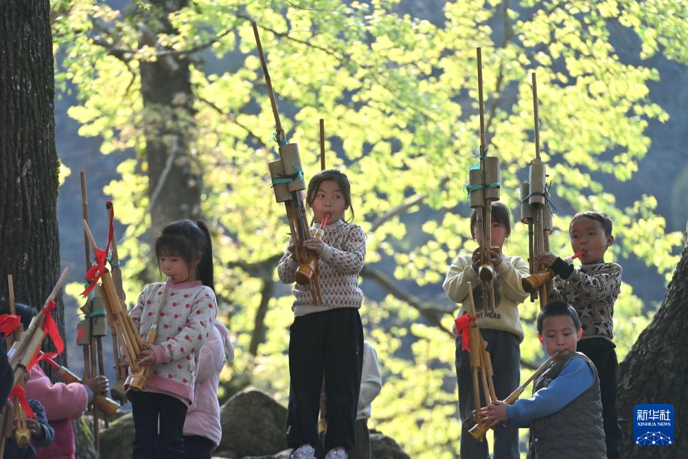 在融水县杆洞乡党鸠村,小朋友在新春民俗活动中吹奏芦笙(2025年1月31日摄)。
