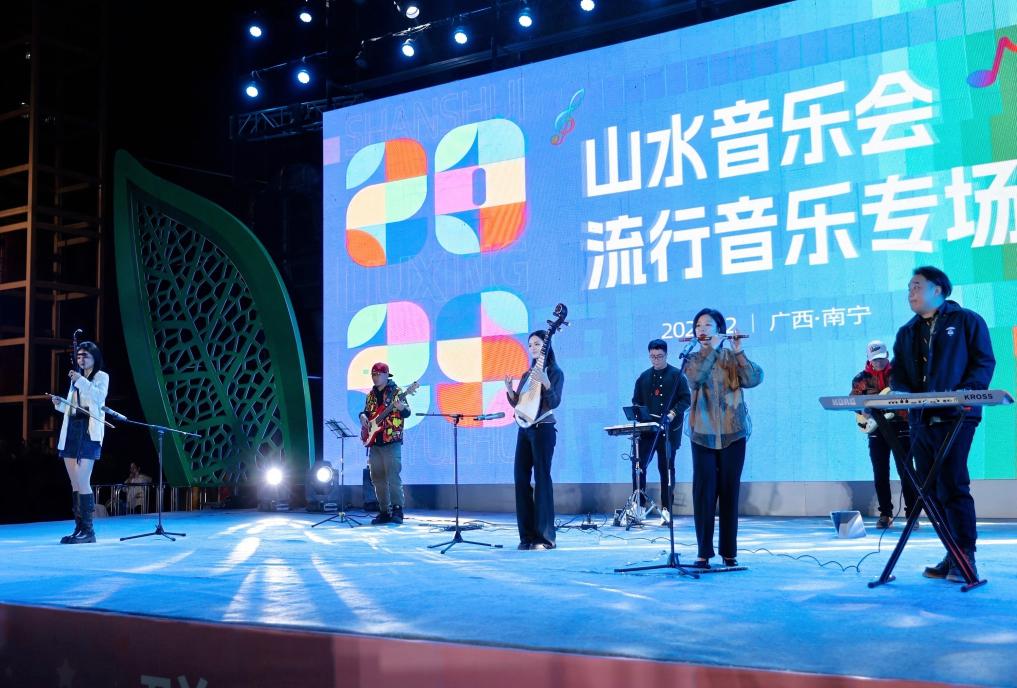 山水音乐会在户外精彩上演。小小民歌专场以童真嗓音演绎广西民谣,悠扬的非遗旋律在这片艺术之地流转;到了流行音乐专场,青年创作者以潮流节拍碰撞地域文化元素,用原创旋律诉说时代感悟,吸引年轻群体共鸣,实现新大众文艺的代际破圈。两场专场演出以沉浸式体验让观众从“旁观者”变为“参与者”,彰显新大众文艺“共享传播”的鲜明特征。